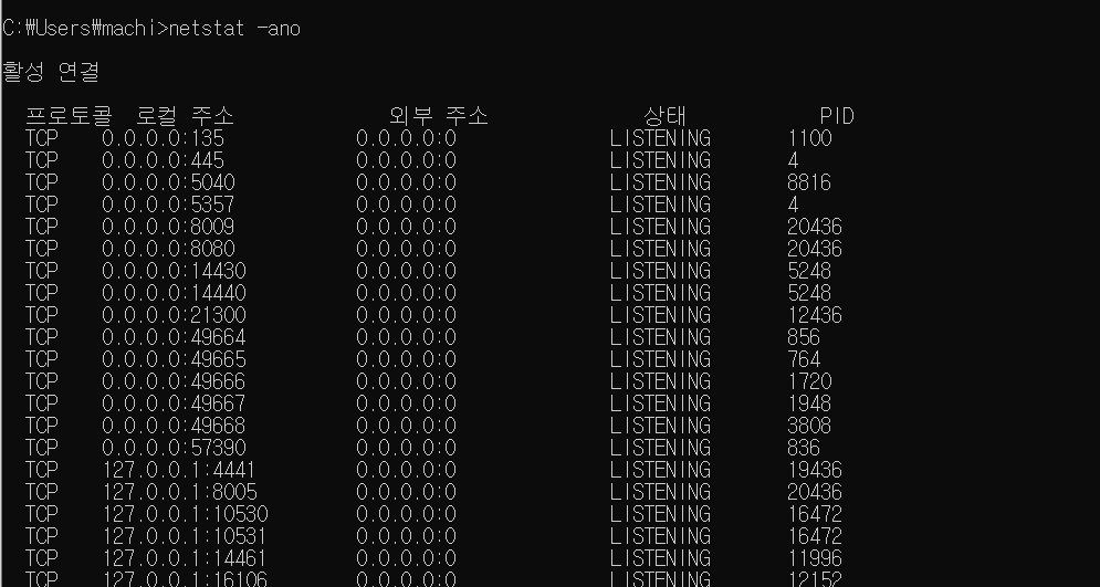 먼저 netstat -ano 명령어를 실행시켜준다.